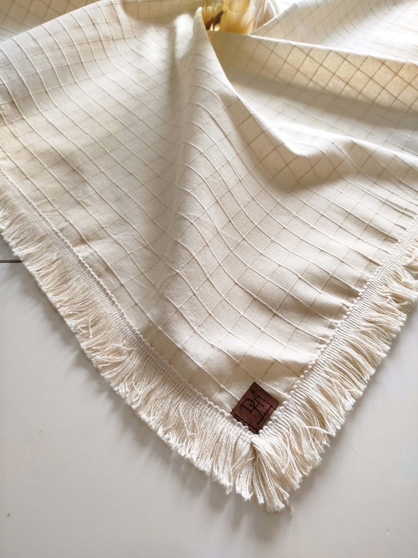 – %100 pamuk buldan keten kumaştan üretilmiş, dayanıklılığı ve doğal dokusuyla öne çıkan bir masa örtüsüdür. – Geometrik desenleriyle modern ve şık bir görünüm sunan bu masa örtüsü, bohem tarzınıza zarif bir dokunuş katıyor. – Kare şekli sayesinde çeşitli masa boyutlarına uyum sağlar ve estetik bir bütünlük oluşturur. – Bej rengiyle her türlü dekorasyonla kolayca uyum sağlar ve mekanınıza sıcaklık katar. – 105 x 105 cm boyutlarındaki geniş yüzey alanı ile geniş kullanım alanı sunar; yemek masanızdan oturma odanıza kadar her türlü ortama uygunluk gösterir. – Kolay bakım imkanı sağlayan 30 derecede yıkama talimatına sahip olması sayesinde uzun süre ilk günkü kalitesini korur.